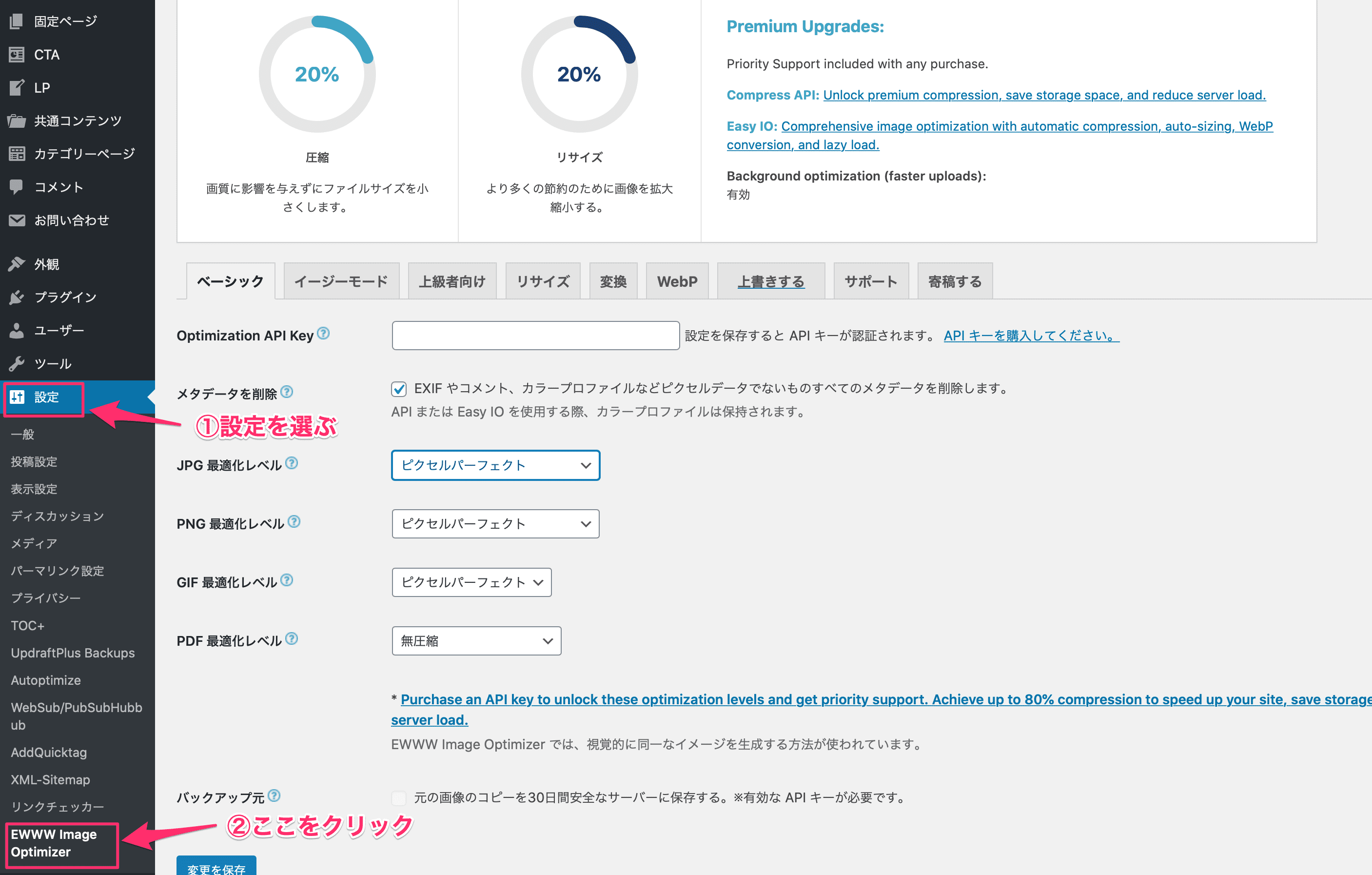 左メニューの設定から、「EWWW Image Optimizer」をクリックします。