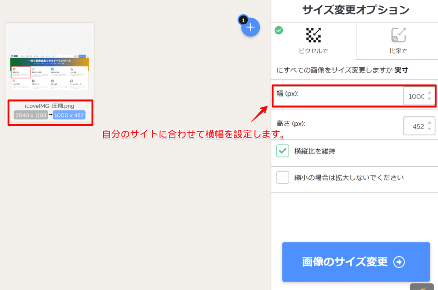 上記のように、圧縮前に1000×452(px)に変更しました。