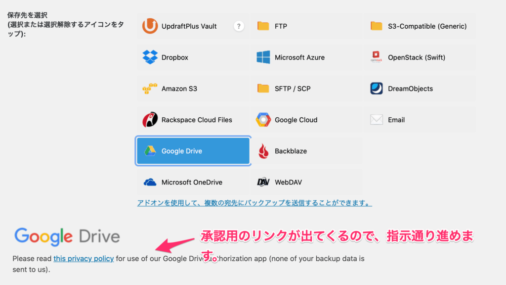 画像では承認済みのため表示されていませんが、Google Drive承認用のリンクが出るので、指示に従ってください。