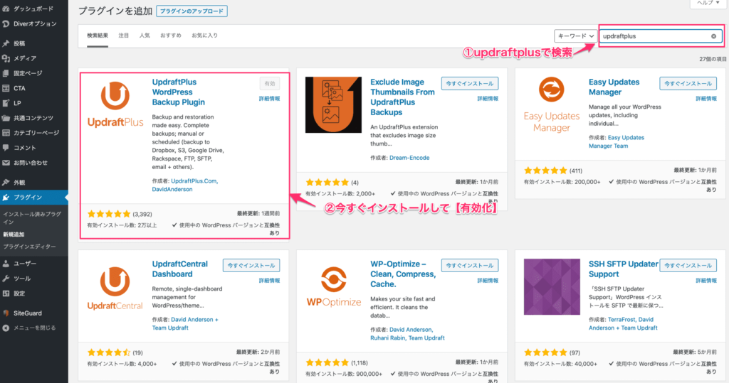 updraftplusで検索して、今すぐインストール→有効化をクリック。