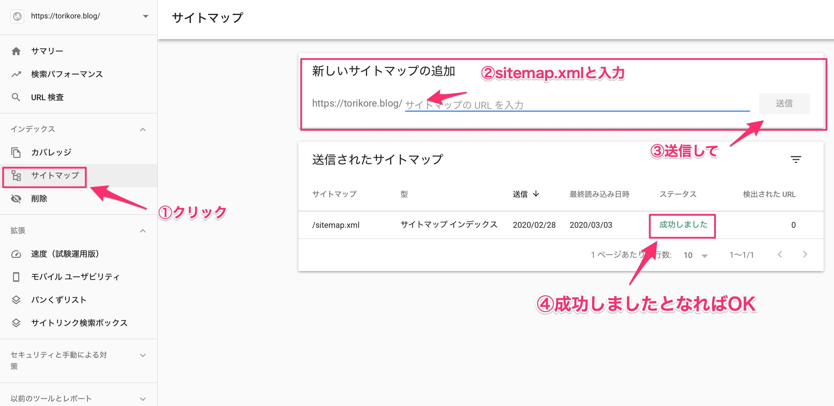 次はXMLサイトマップをサーチコンソールへ追加します。